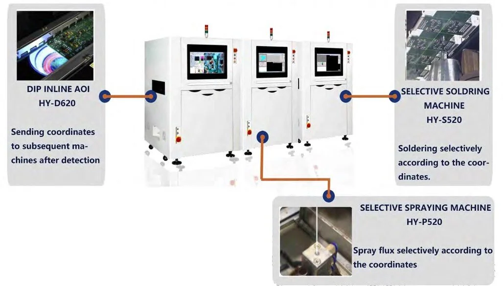 The HY-D620 is a DIP Inline Automatic Optical Inspection machine. It uses advanced automatic optical inspection (AOI) to find soldering defects, and it is extremely accurate. In fact, it detects over 99.9% of all soldering defects! Once it detects a defect, it records the coordinates, which are sent to the next machine. For more information on the HY-D620 and how AOI works, click here.